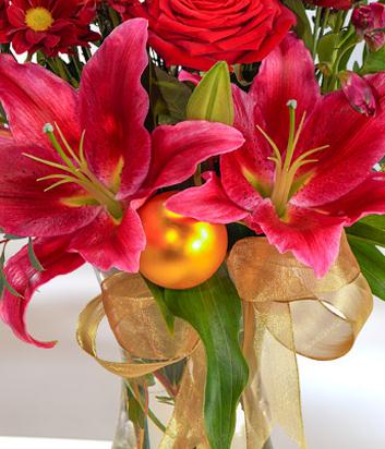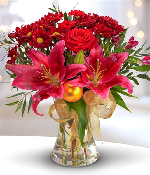A fantastically festive Christmas bouquet featuring red Roses, Chrysanthemums and Carnations married with pink Lilies and cerise Alstroemeria beautifully finished with a gorgeous gold bauble. A delectable combination and the perfect Christmas gift.