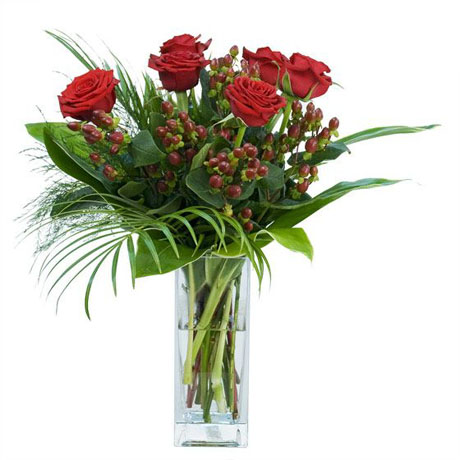 6 Lush Red Roses with Hypericum berries and foliage expressing your love.