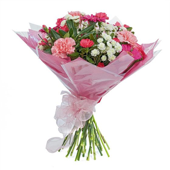 A handtied bouquet consisting of carnations, spray carnations, mini gerbera, chrysanthemum and assorted foliage.