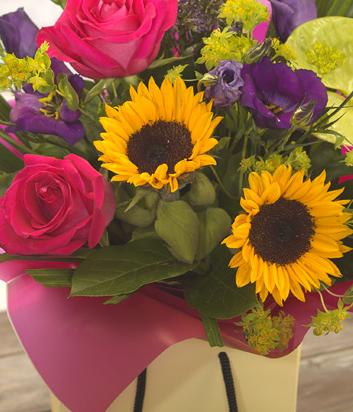 This bright and cheerful hand-tied is aqua packed for freshness. Scented Roses are accompanied by bright Sunflowers, vibrant Anthuriums and delicate Lisianthus.