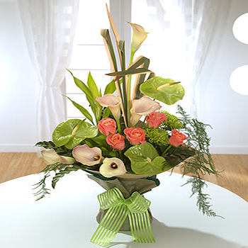 Green Anthurium, Roses and Calla Lilies create the perfect leading cast for this statement aqua pack. Just right for a wedding or engagement gift.