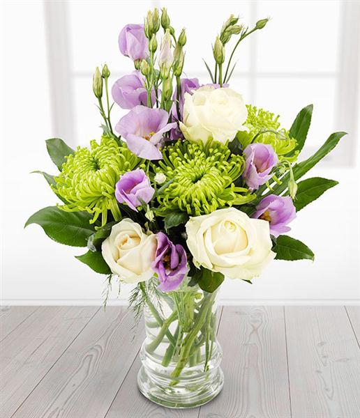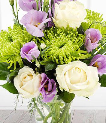 Lovely lilac Lisianthus blooms with glorious green Chrysanthemums and creamy white Roses.