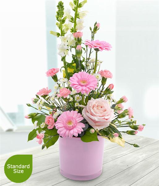 Includes Pink Rose, Pink Germini, White Anthirrinum, White Spray Chrysanthemum, Pink Spray Carnation, Eucalyptus, Variegated Ivy.