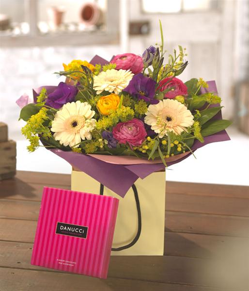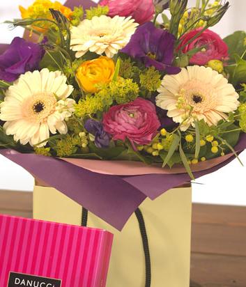 A colourful hand-tied bouquet full of fragrance and including Spring flowers; Mimosa, Ranunculus, Germini and Lisianthus delivered in a gift set with 9 Danucci Milk Chocolates. Flowers designed to go directly in a vase.