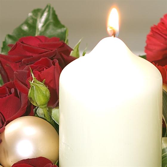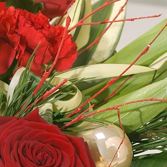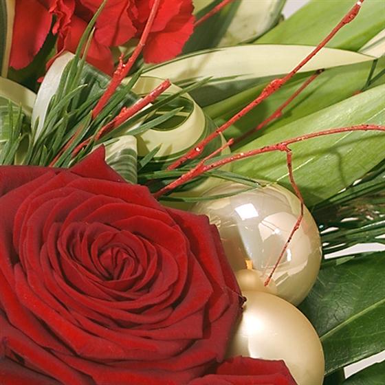 An ideal Christmas candle centrepiece. Beautiful burgundy Germini, red Tulips, Roses and Carnations have been expertly combined with an array of winter foliage.