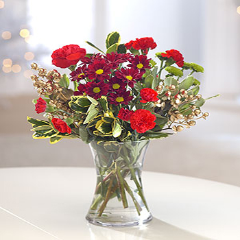 A classic Christmas bouquet of red Chrysanthemums and Carnations complemented by festive foliage.