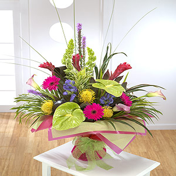 An elaborate design with tropical flowers starring Anthurium, Gerbera and Calla Lilies and exquisite foliage.