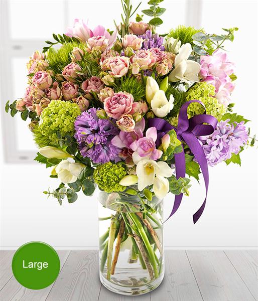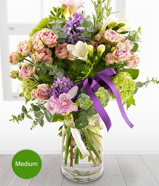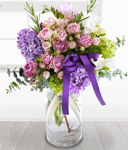 An exquisite pastel shade Vase Arrangement. Pink spray Roses and blue Hyacinths are married perfectly with pink and white Freesia, green Viburnum and Sweet William blooms. Fantastically fragrant.
