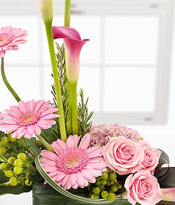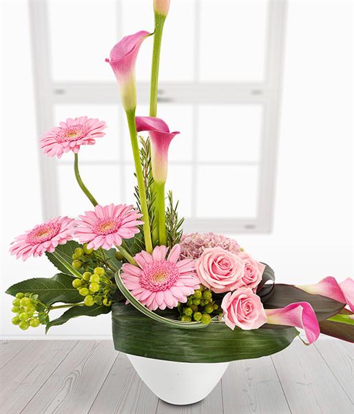 Make a statement with this incredible pink Calla Lily, Germini, Rose and Hydrangea container arrangement. Green Hypericum Berries, a touch of Rosemary and a flourish of foliage complete the piece to perfection.