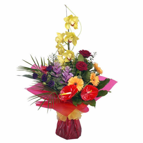 A modern hand-tied bouquet of mixed flowers in bold colours. Including Roses, Anthurium, Lisianthus, Gerbera, Orchids and Chrysanthemums. The bouquet is finished with striking packaging in an aquapack for instant display.