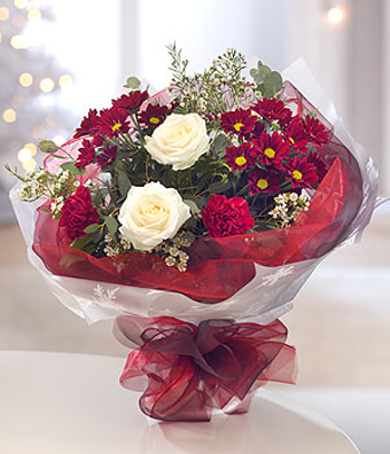 A perfectly lovely and sumptuous arrangement of ruby red blooms and cream white roses, make this a gorgeous Christmas flower arrangement.