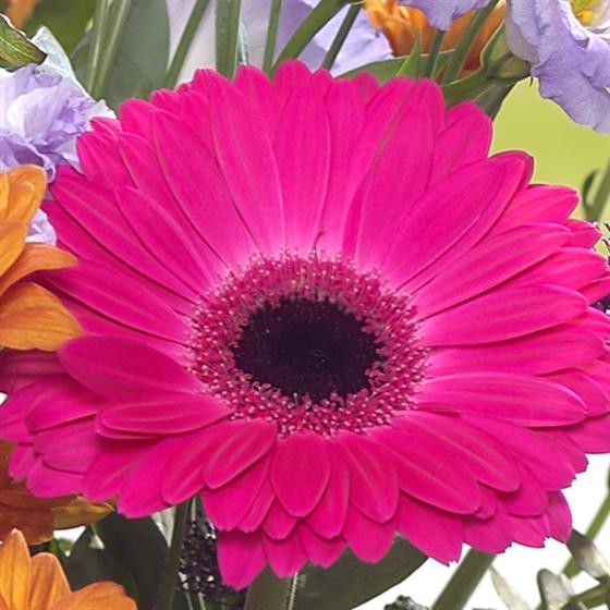 The dramatic cerise Gerberas offset against fiery Roses, Chyrsanthemums and purple Trachelium create this rich flower arrangement.