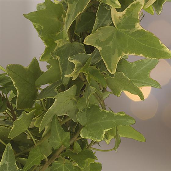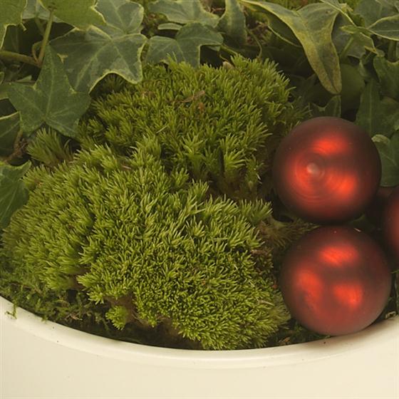 Swedish designed Christmas plant arrangement. A ring of variegated Ivy simply decorated with a red felt heart and red frosted baubles.