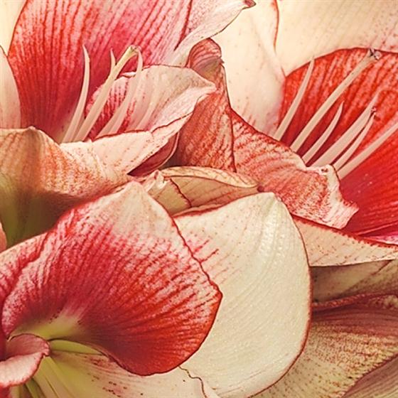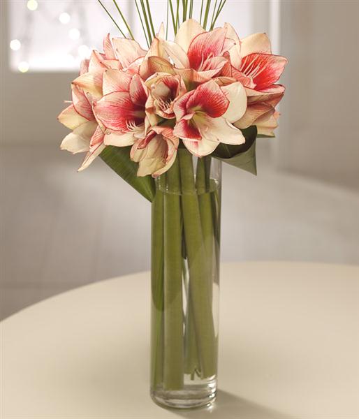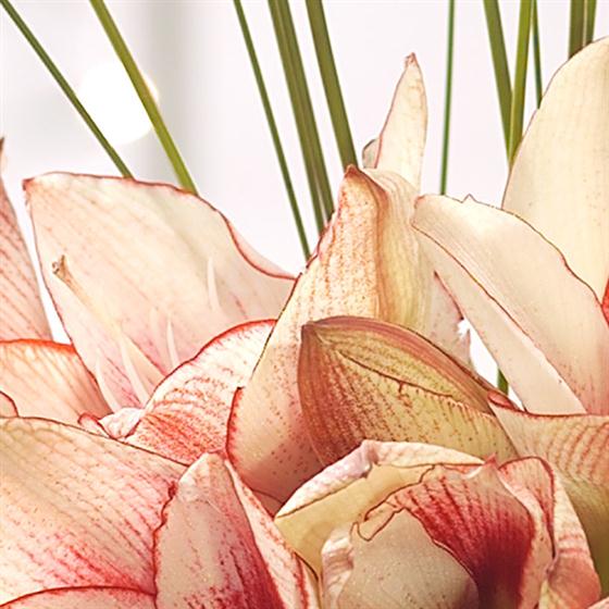 Pretty red and white Amaryllis blooms with a striking flourish of Bear Grass, perfectly arranged in an elegant, clear glass vase. A very attractive Christmas flower gift.