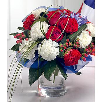 Red and white Roses have been expertly combined with blue Agapanthus to create this truly glorious hand-tied aqua packed bouquet.