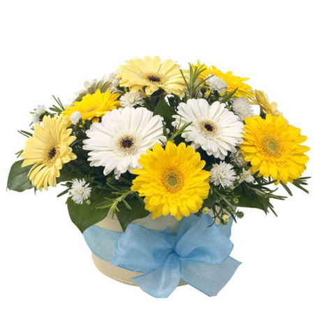 This delightful modern arrangement of complementary shades of yellow Gerbera, Germini, Montbretia and foliage is presented in a lemon coated galvanised tin container with organza bow detail.