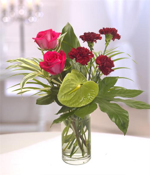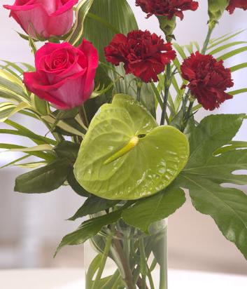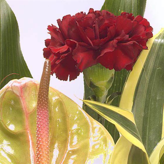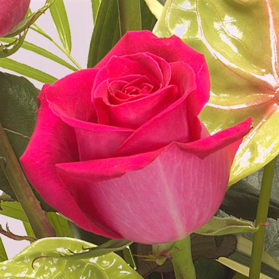 A sleek and stylish bouquet for a modern look containing cerise Roses, green Anthuriums and exotic foliage.