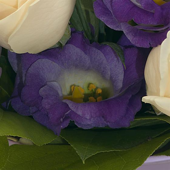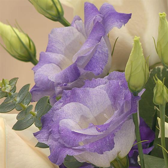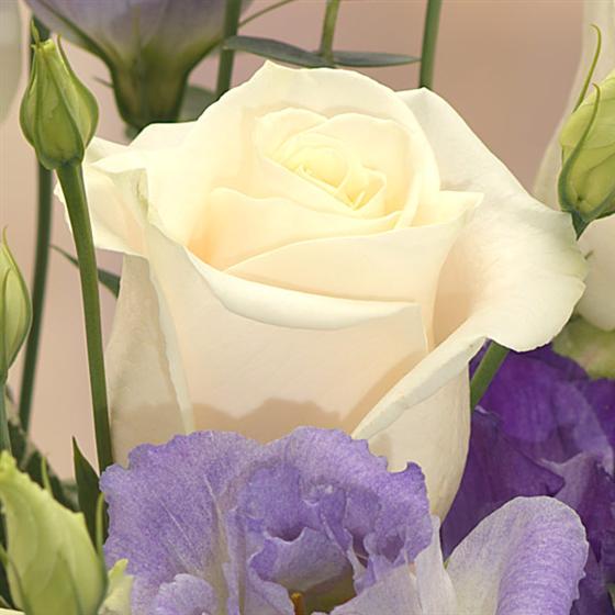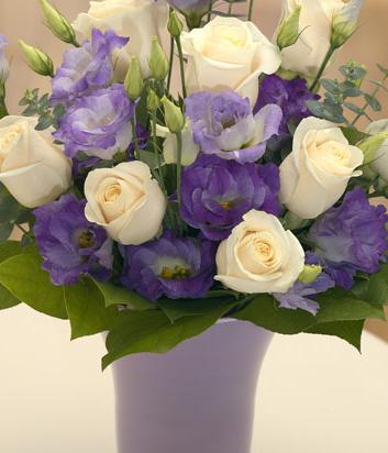 An ideal gift of cream Roses and purple and mauve Lisianthus delivered in a vase.
