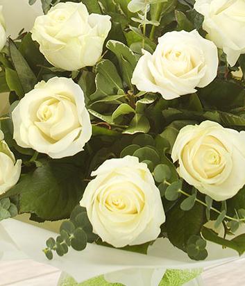 12 White Rose, Eucalyptus, Variegated Pittosporum.