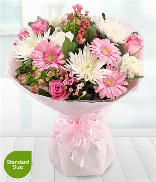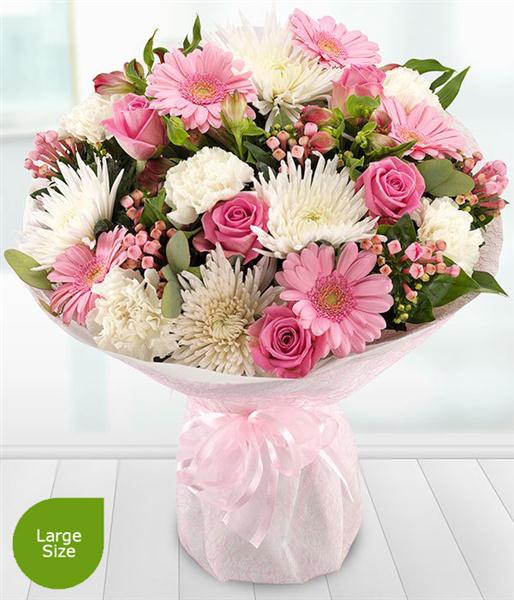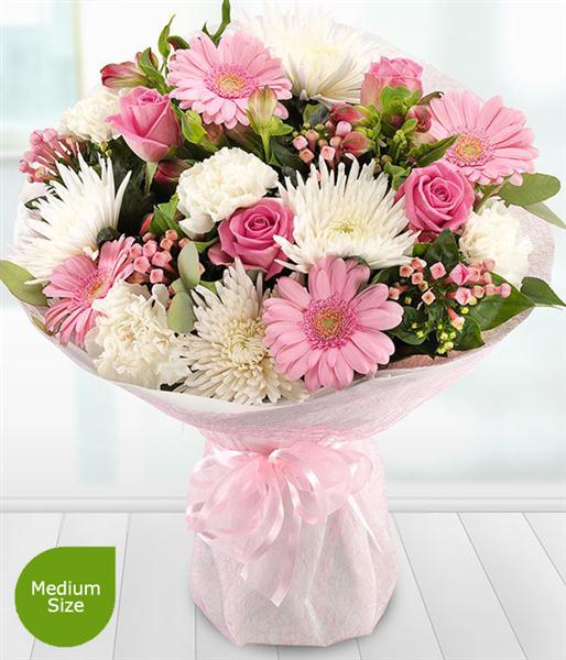 Includes White Chrysanthemuma, Pink Germinia, Pink Rosea, Pink Bouvardia, Pink Alstroemeria, White Carnationa, Eucalyptus, Salal.