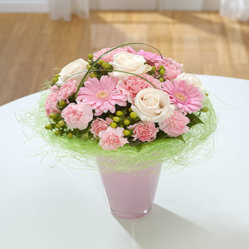 A compact vase arrangement of pale pink Roses, Germini, spray Carnations and green Hypericum sitting on a delicate green sisal collar.