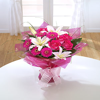 Rose, Lily and Germini hand-tied featuring hot cerise Roses and mini Gerbera.