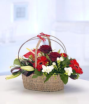 A delightful traditional basket arrangement of mixed red and white flowers including red Roses, Freesias, Gerbera, Lilies and Anthurium. Flowers are arranged in floral foam for long lasting freshness and easy display.