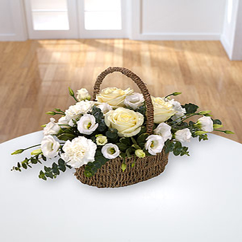 An Oval basket arrangement of white sympathy flowers, including Roses and carnations
