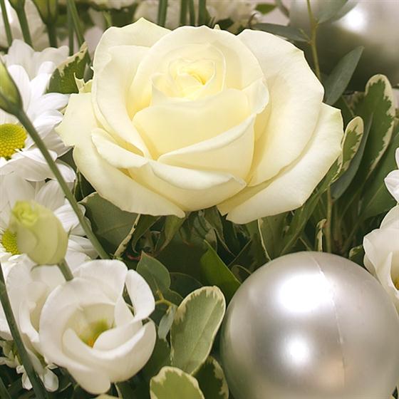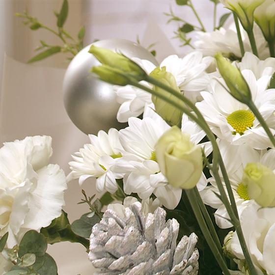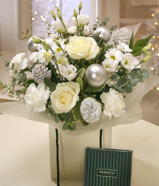 Crisp, cool creams and whites in the form of Roses, Lisianthus and Carnations, combined with Eucalyptus and Ruscus create a beautiful snowy white aqua pack gift bag bouquet. Includes a delicious box of 9 Danucci Dark Chocolates.