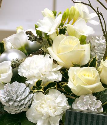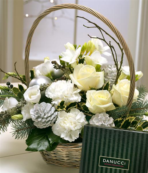 A beautiful Christmas flower basket comprising of cream Roses, white Freesias, Lisianthus and Carnations. Pine Cones, Holly sprigs and 9 Danucci Dark Chocolates complete this stunning flower gift.