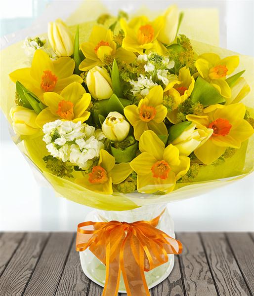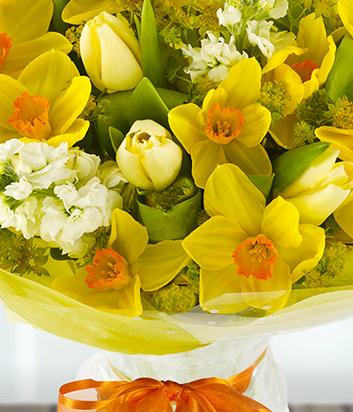 end some sunshine with this cheerful aqua-pack of yellow Daffodils, cream Tulips and white Stock topped with Bupleurum.