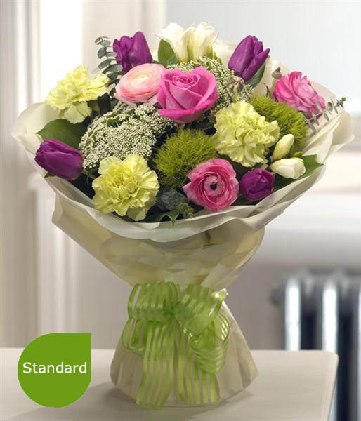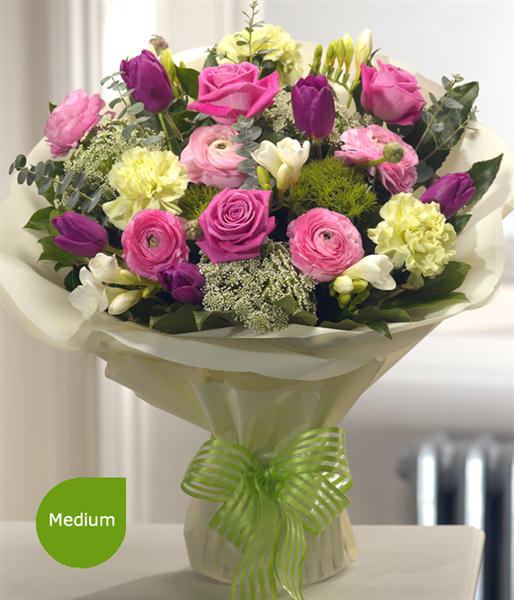 Delicately fragrant and stunning in design, this aqua pack bouquet is a spring fresh, sophisticated arrangement featuring Roses, Tulips, Carnations, Freesias and Ranunculas.