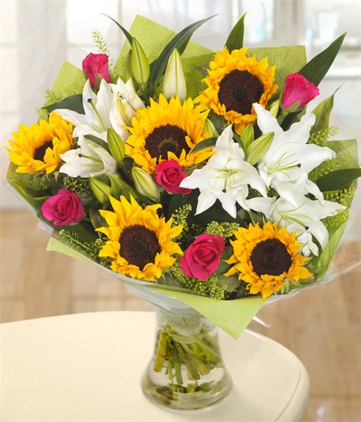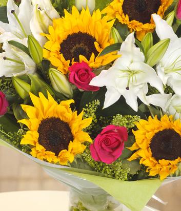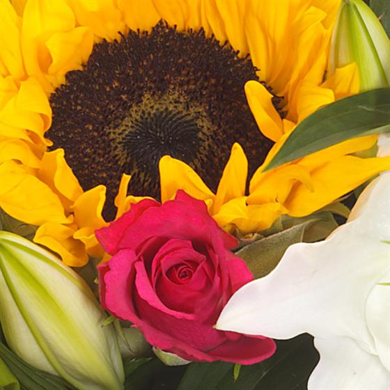A bright and sunny arrangement of Sunflowers, Oriental Lilies, cerise Roses and green Bell flowers. An absolutely stunning and fabulously fragrant bouquet.