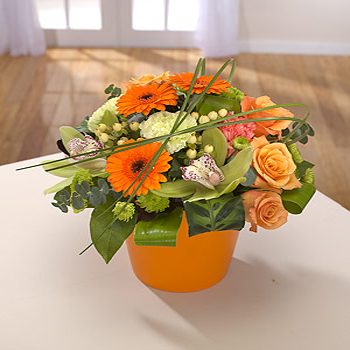 Orange Germini and Roses mixed with green Carnations and Cymbidium Orchid heads. This container arrangement is bursting with colour and vitality.