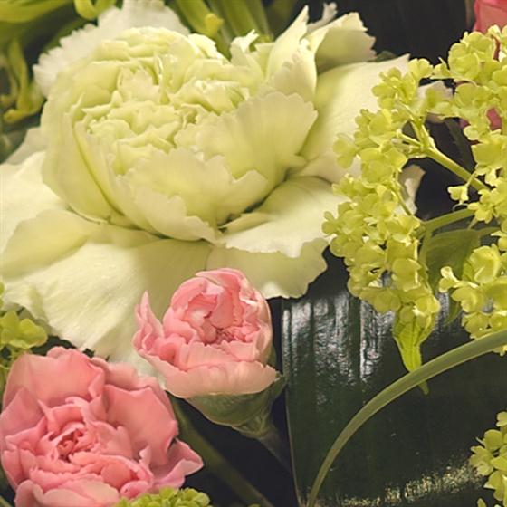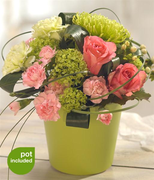 This Mother's Day flower arrangement is just stunning. Featuring gorgeous pink Roses and Carnations, set against a backdrop of sumptuous green Chrysanthemum Blooms. A flourish of Steel Grass perfects the fragrant display.