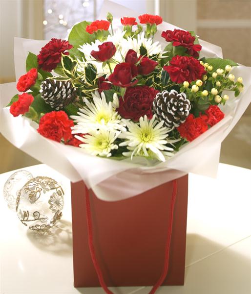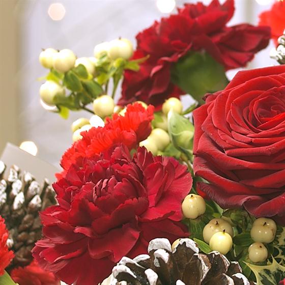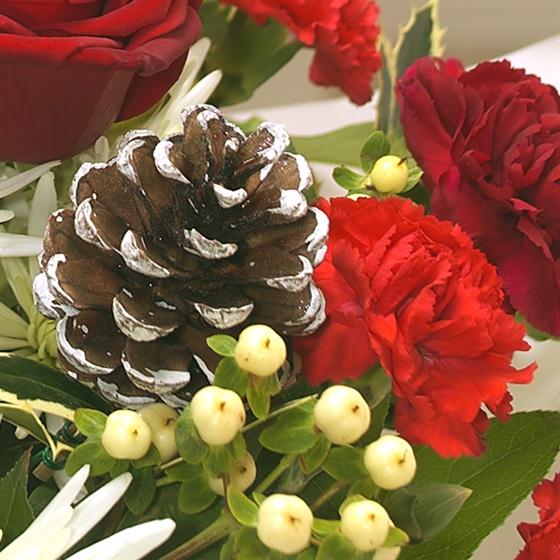 An ideal Christmas flower gift - rich red Roses married with deep red velvety Carnations sit perfectly alongside the creamy white flourishes of Spray Chrysanthemums. White frosted Pine Cones complete the gift.