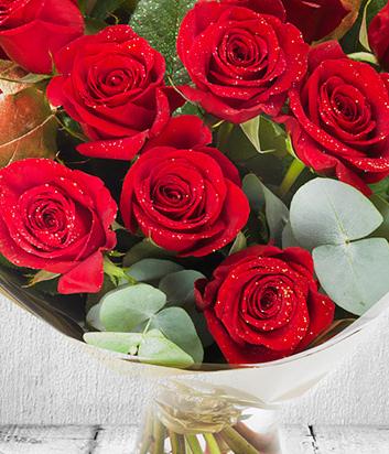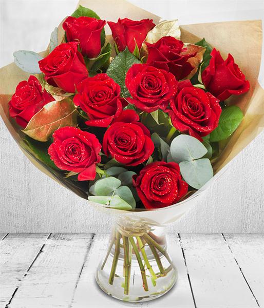 12 Superb red roses presented with gold salal foliage and topped with eucalyptus.