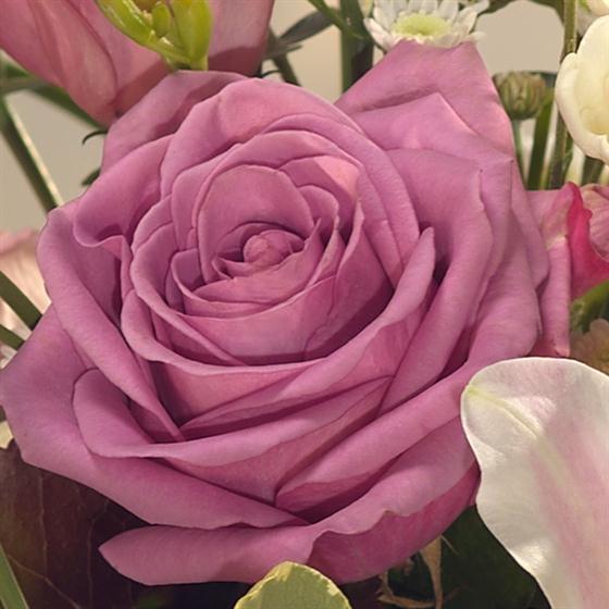 A sleek white glass vase packed with pink Roses, Lisianthus and Oriental Lilies. White Freesia and Chrysanthemums complete the look. An ideal Mother's Day gift that smells incredible and requires no arranging.