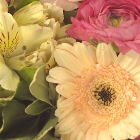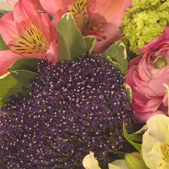 A delightful vintage hand-tied featuring Roses, Germini, Alstroemeria, Ranunculus, Trachelium and Viburnum Opulus. Designed to go directly in to a vase.
