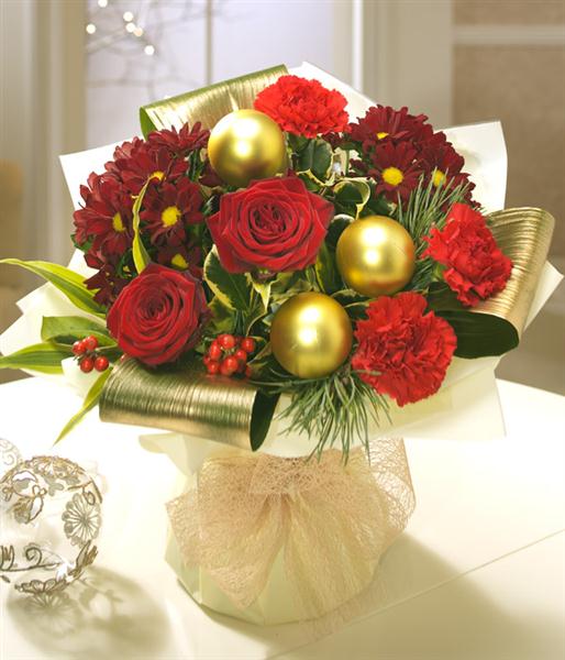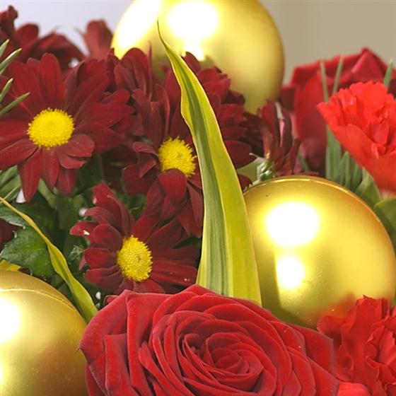 A sumptuous Christmas aqua pack bouquet featuring velvety red Roses, ruby red Carnations and deep red spray Carnations. A flourish of variegated Holly and sprinkling of golden baubles complete the design.