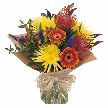 Virgos give selflessly and are pure in heart whilst spreading light and calm. What better choice of flowers than this hand-tied bouquet in elegant shades of orange and gold featuring Gerbera, Veronica, Hypericum and Chrysanthemums beautifully presented in an aquapack for instant display.