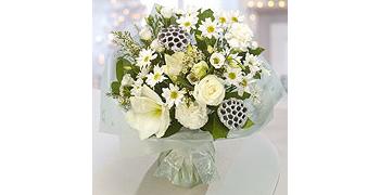 A stunning, classic, crisp white aquapack of white Amaryllis, Roses, Carnations, Chrysanthemums and Wax Flowers. A wonderful Christmas flower gift that will look magnificent in any setting.