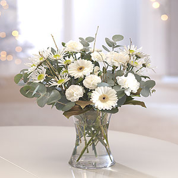 A winter wonderland of crisp white flowers: Germini, Chrysanthemums and Carnations come together to form a classic Christmas flower combination.