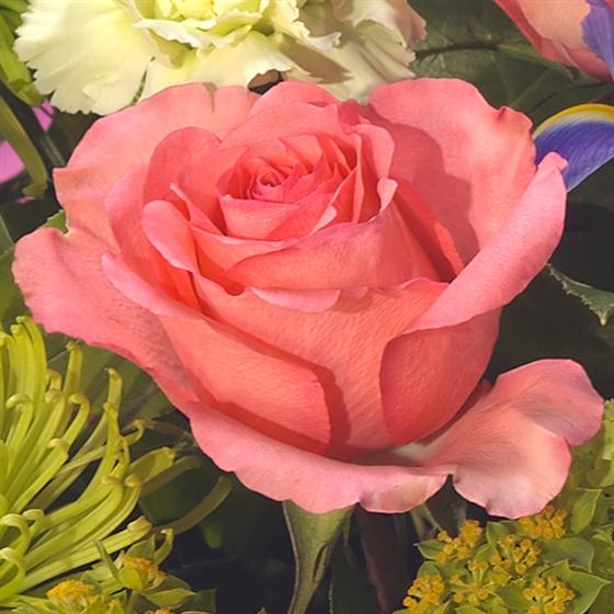 Pretty pink Roses and Irises have been beautifully combined with green Bloom Chrysanthemums and Carnations to create this simply gorgeous and delicately fragrant Mother's Day aqua pack bouquet.