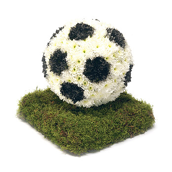 Based Chrysanthemum wreath in the shape of a football on turf. Size: Base - 30cm (12") Height - 33cm (13").