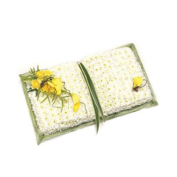 Covered in a mass of white double chrysanthemums and finished with sprays of roses fern chrysanthemums edged with matching ribbon.