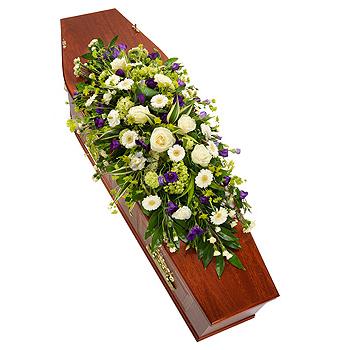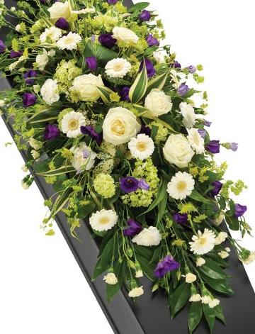 A gorgeous white casket spray interspersed with purple Lisianthus blooms. White Roses, Germini, Carnations and Viburnum are lovingly arranged with an assortment of foliage.