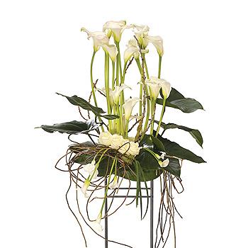 An elegant white Calla Lily and Rose arrangement. Aspidistra and Philodendron leaves with a flourish of Ivy complete the design.